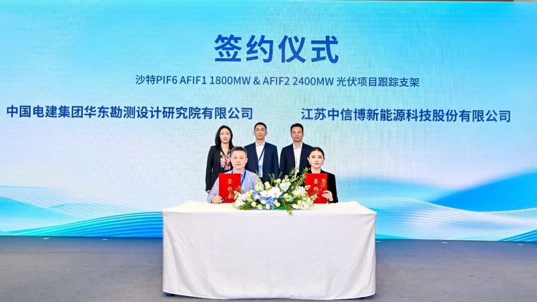 日前,中信博与中国电建集团华东勘测设计研究院有限公司(下文简称:电建华东院)签署沙特PIF6 AFIF 4.2GW项目合作协议。电建华东院副院长吴世东、中信博高级副总裁周石俊等共同见证签约,电建华东院国际公司供应链部副总经理俞剑平、中信博中国区总裁郭菲分别代表双方签署协议。