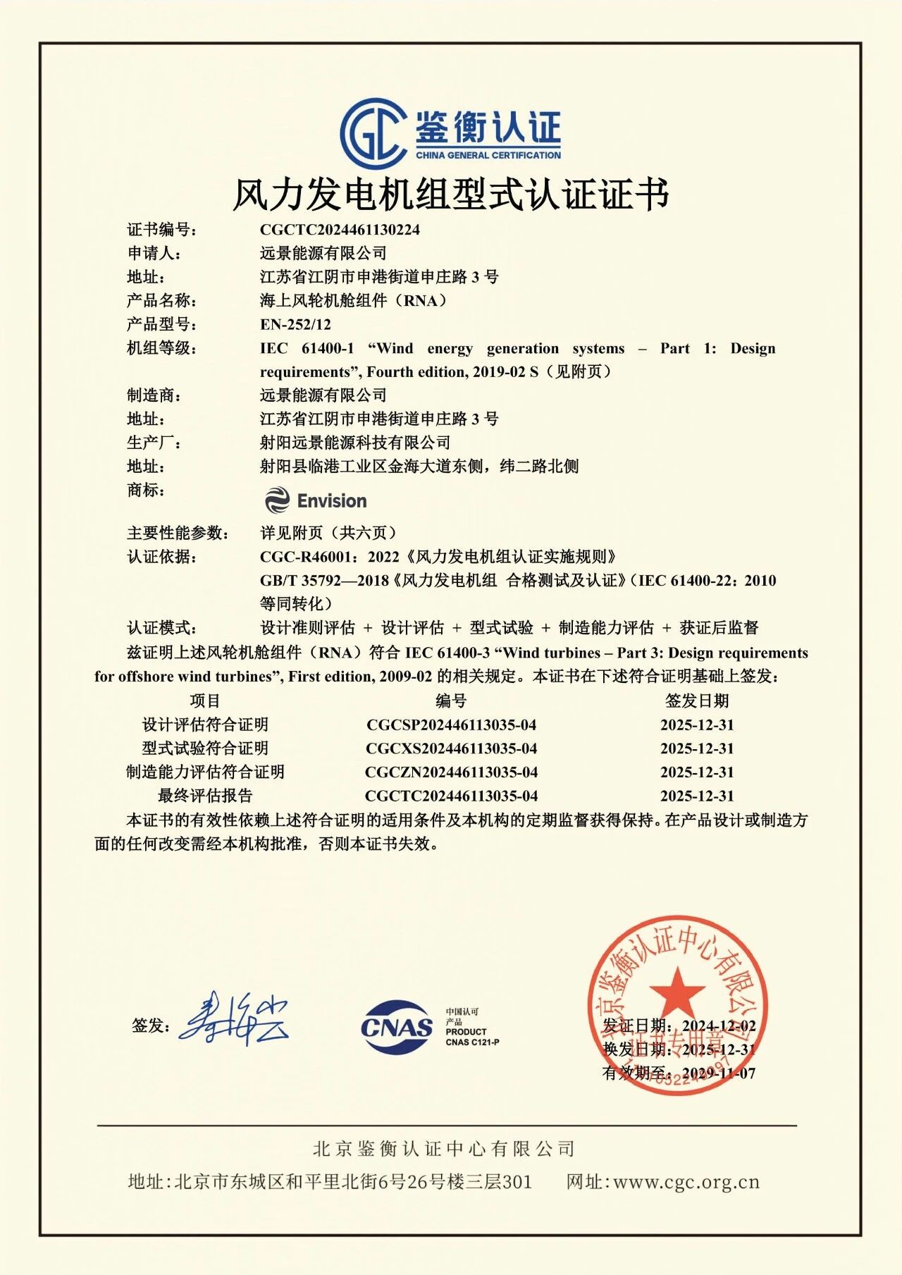 开启风电高效新时代!远景Model Y平台获国际认证加持