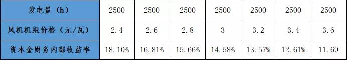 据国家发改委价格司消息,陆上风电项目2019年I、Ⅱ、Ⅲ、Ⅳ类资源区电价在2018年基础上分别下调0.05-0.06元/千瓦时。也就是说,原有具备投资价值的项目可能无法满足内部投资收益要求,对于新能源企业来说,保障投资收益的突破点在于通过技术创新提高发电量及成本控制。以一个Ⅳ类某地区的5万千瓦的平原风电场为例,项目建设成本中风机部分占比为40%-50%,假定行业内去除风机机组价格的建设水平为3.5元/瓦,年有效发电小时数为2500h,机组价格对于风电项目投资收益影响见下表: