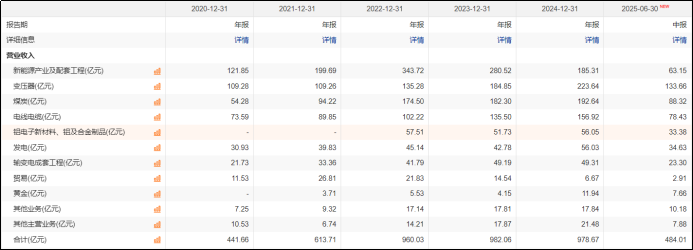 其中,输变电核心设备是业绩“压舱石”。2024年,变压器、开关、电容器等电气设备收入达到223.6亿元,占总营收比重23%,毛利率17.6%。如果再把电线电缆的156.92亿元和输变电成套工程(EPC)的56.03亿元算进来,广义输变电板块收入将近436.55亿元,占比达到46%以上。2025年上半年,公司这块收入合计达到235.39亿元。