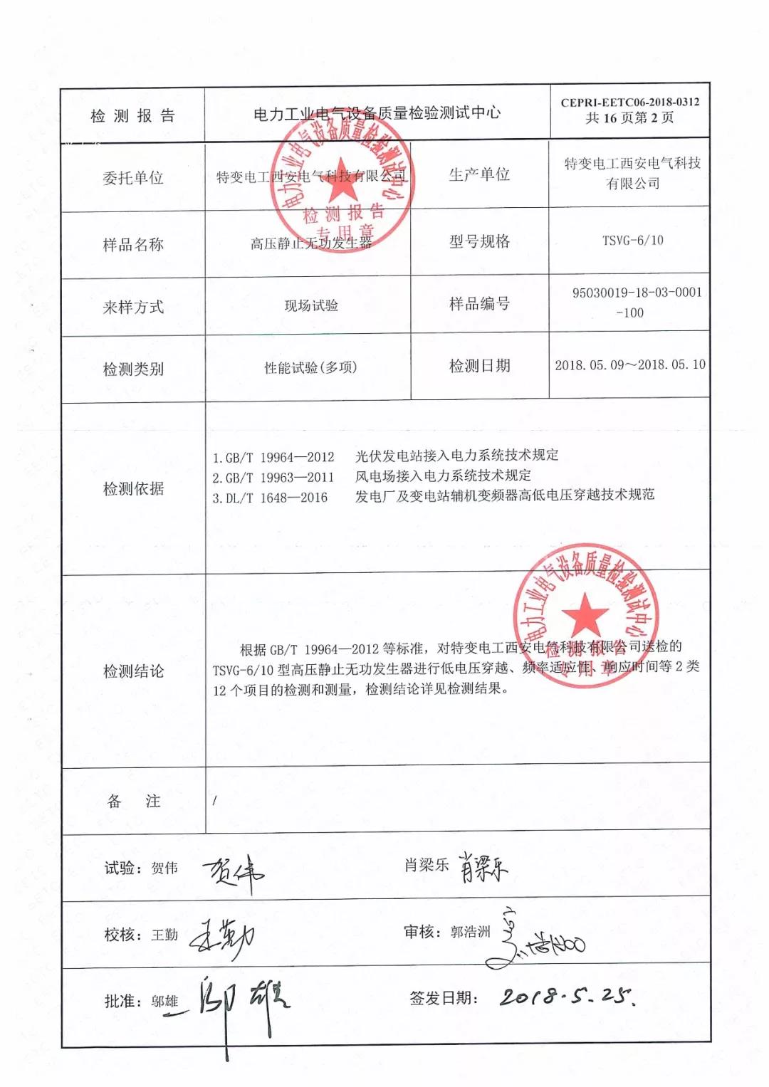 特变电工第四代TSVG在2018年5月份成为行业第一批成功取得国网电科院颁发的高低穿认证报告的产品,满足国网文件中对高低穿能力和认证的要求,提高产品稳定性。