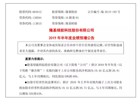 隆基股份2019半年度业绩预增公告出炉 净利润同比增加50%到60%