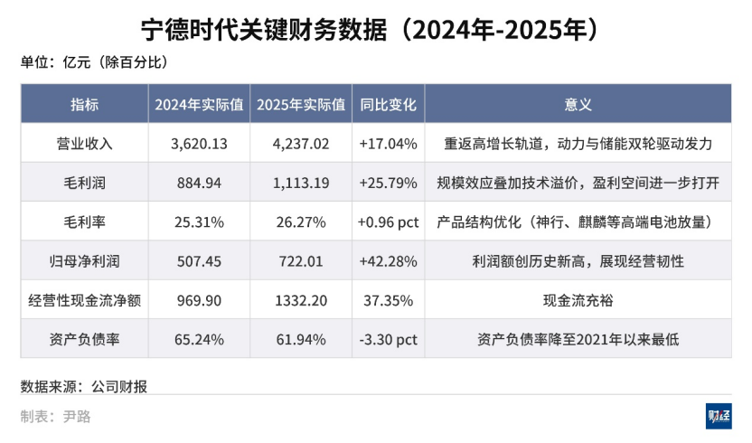 宁德时代2025年的营收达4237亿元,同比增长17.04%;净利润为722亿元,同比增长42.28%。在高基数之上,归母净利润和扣非净利润的增速均高于营收增速,表明公司的盈利能力提升。