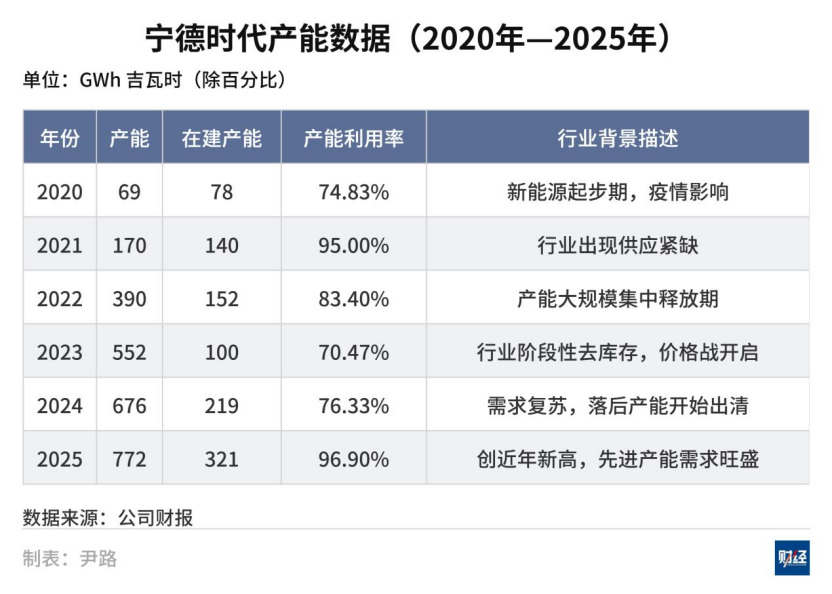 2021年电池严重供不应求,车企在电池企业门口排队等着提货,当年宁德时代的产能利用率为95%。2025年,在宁德时代总产能扩大至772GWh(吉瓦时),为2021年4.5倍的基础上,产能利用率上升至96.9%,创下历史新高,产线基本处于满负荷运转状态。