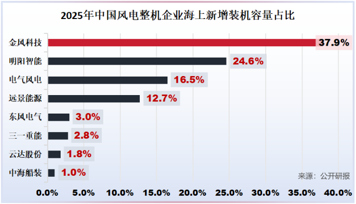 从国内竞争格局来看,2025年金风科技的海风首次超越了明阳智能,全年新增装机242台,容量208.9万千瓦,占比37.6%,比上一个海风老大明阳智能多出13个百分点。
