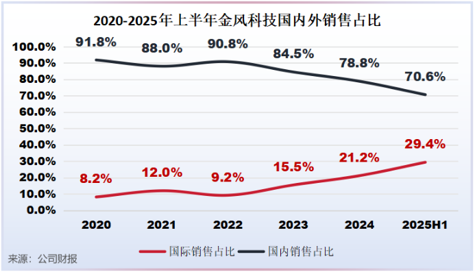 在收入结构表现上,2020年至2025年上半年金风科技国外销售占比从8.25%快速增长至29.4%;同期,公司国内销售收入占比从91.8%下滑至70.6%。