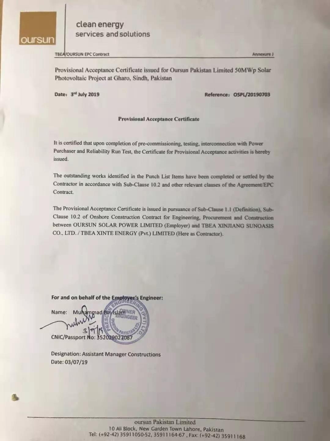 在国内竞价项目获批之际,国际项目也传来喜讯,由特变电工新疆新能源股份有限公司承建的巴基斯坦OSPL50MW光伏电站,获得业主方OURSUN颁发的临时验收证书(PAC)。