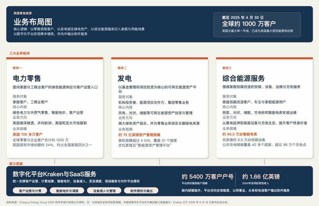 它的主要业务分为四个板块:电力零售、新能源发电、综合能源服务、数字化平台(Kraken海妖平台)。