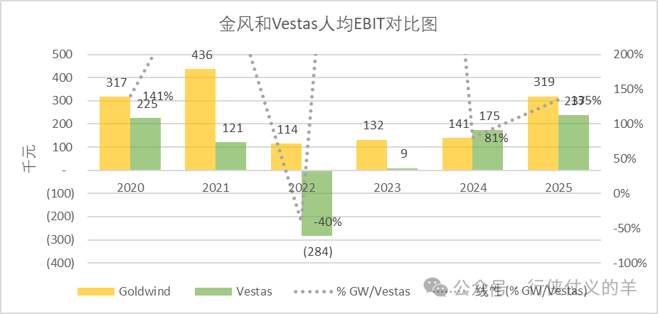 虽然金风科技单位人力成本只有维斯塔斯的60%多,但创造了比维斯塔斯高的人均息税前利润(EBIT)。