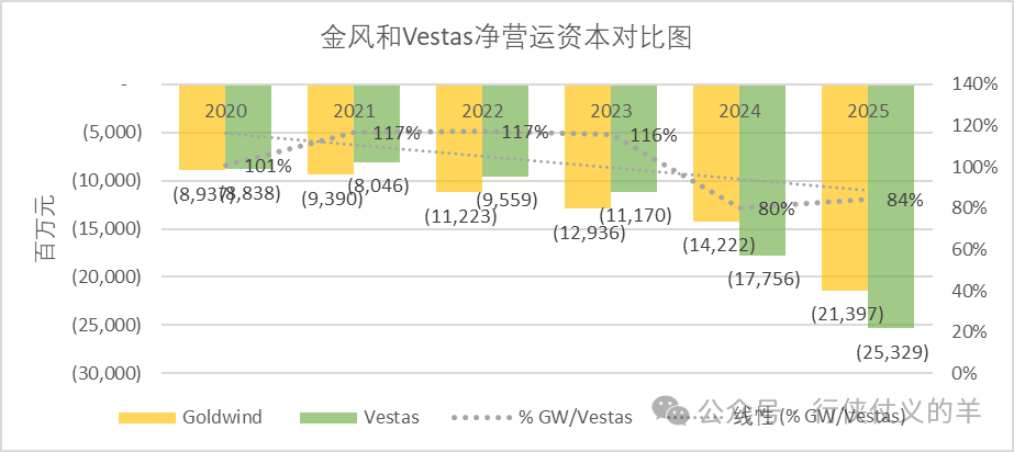 金风科技和维斯塔斯净运营成本均为负数,两家公司均通过占用供应商资金支持运营。2025年维斯塔斯净运营成本负数扩大,占收入比达到17%(2024年13%),金风科技净运营成本(负数)占收入比也有所提高,达到29%(2024年25%)。