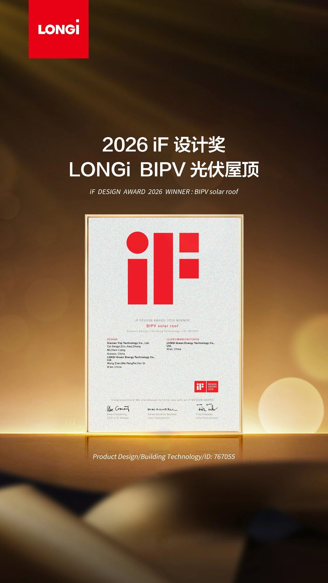 日前,隆基绿能家庭绿电解决方案LONGi eHome BIPV光伏瓦,荣获2026年德国iF设计奖“产品设计/建筑技术”类别大奖。