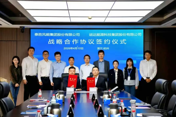 近日,泰胜风能集团股份有限公司董事长黎伟涛一行到访运达杭州总部,与运达能源科技集团董事长陈棋开展座谈交流。双方围绕供应链深化、资源开发、新能源投资及技术协同等议题深入交流,并成功签署战略合作协议。