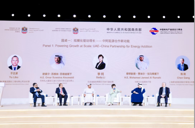 4月13日,由中华人民共和国商务部、阿拉伯联合酋长国对外贸易部联合主办的“中国—阿联酋企业推介会”在北京隆重召开。作为中阿双边政府及工商界高层对话、共谋发展的战略性交流平台,本次大会汇聚了中阿双方多家能源领域重要企业代表参会,包括中国电建国际工程有限公司总经理于立波、阿布扎比国家石油公司(ADNOC)执行办公室负责人欧麦尔·苏维纳·苏维迪阁下、阿布扎比未来能源有限公司(Masdar)首席执行官穆罕默德·贾米勒·阿尔·拉马希阁下、比亚迪股份有限公司执行副总裁李柯等。爱旭股份作为此次活动唯一的光伏企业受邀参会,在“规模化驱动增长——中阿能源合作新动能”圆桌论坛上,爱旭股份董事长陈刚与各方嘉宾深度探讨了中阿能源合作的高质量发展愿景。