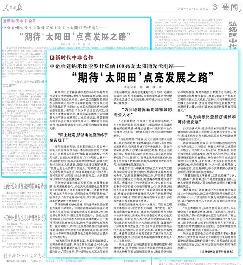 4月14日,人民日报刊发《中企承建纳米比亚罗什皮纳100兆瓦太阳能光伏电站——“期待‘太阳田’点亮发展之路”》专题报道,聚焦正泰新能源与中国江西国际共同承建的纳米比亚罗什皮纳100兆瓦太阳能光伏电站项目。报道多视角展现了在荒漠中建设“太阳田”,如何为当地点亮发展之路。项目采用了正泰提供的光伏组件、逆变器、电缆等关键设备,以应对当地强日照、高温、多风沙的严苛环境,保障电站长期稳定高效运行。报道全面介绍了项目的建设进展、技术特点与运营效益。展现了项目在助力当地能源结构转型、保障民生用电、带动本地就业、培育新能源专业人才、深化中非能源合作等方面取得的积极成效。该项目作为推动纳米比亚能源战略落地的关键一步,将显著提升其电力自给能力,减少碳排放,为当地经济增长和可持续发展注入绿色动力。
