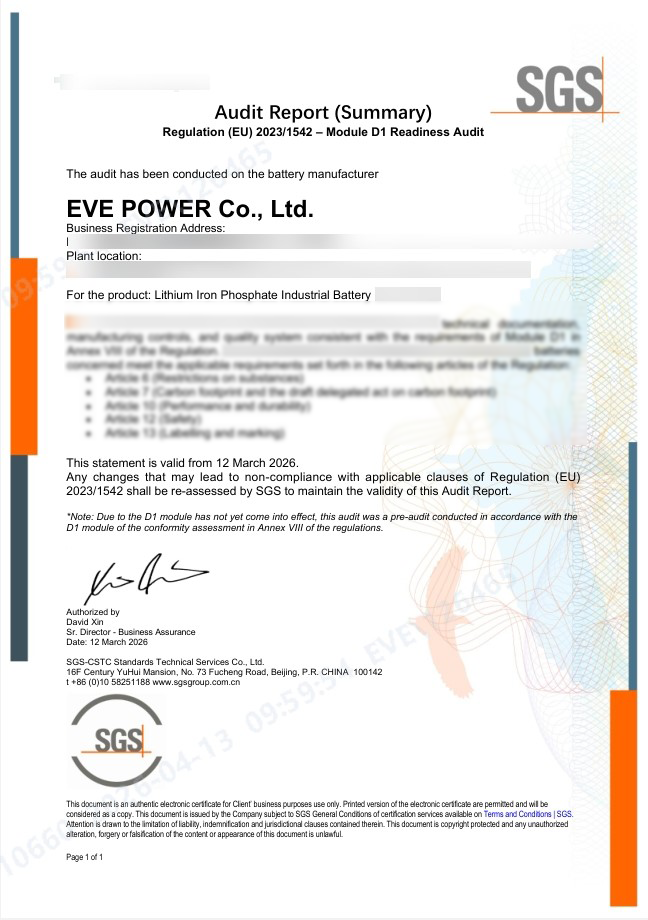 储能大电池欧盟电池法(2023/1542)D1 模式深度核查证书