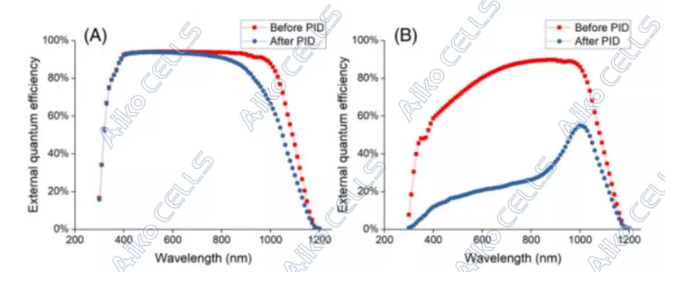 图2 PID测试前后组件正面(A)背面(B)曲线