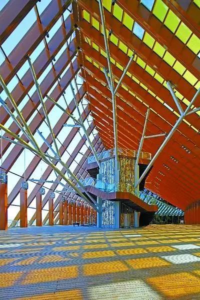 这是因为在设计过程中,建筑师对光伏玻璃的颜色提出了要求:室外侧与普通玻璃颜色接近,体现建筑立面的完整性;而室内侧选用金黄色,用以突显国家的文化性与礼仪性。为满足这一要求,在玻璃的加工过程中,光伏厂家选用了一种黄色封装胶片,这种胶片与薄膜叠加就会呈现这样的效果了。这种薄膜的透光率是可以根据需要进行调整的,通常透光率为20%-40%。当然,透光率和发电效率成反比,也就是说透光率越高,发的电也就相应减少了。