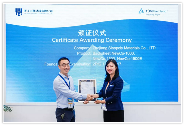 浙江中聚材料背板NewCo-1000、NewCo-1500、NewCo-1500E荣获TÜV莱茵颁发的2PfG 1793 11/17证书。