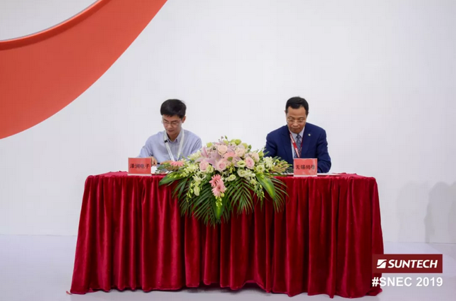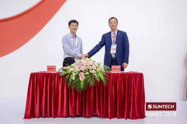 6月4日,尚德电力在SNEC2019展会现场与东莞泽润电子科技有限公司(ZeRun)签署战略合作协议。双方的合作从泽润电子的高可靠性常规接线盒方案开始,逐渐进行产品的技术验证和市场推广。泽润电子总经理 陈泽鹏先生、尚德电力副总裁 张卫先生出席签约仪式。