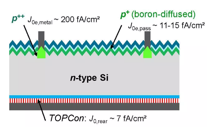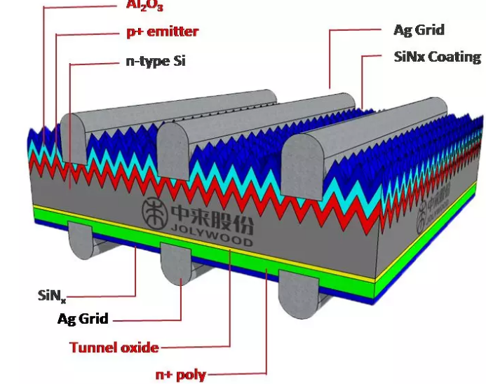 隧穿氧化层钝化接触(Tunnel Oxide Passivating Contacts)电池的概念由德国夫琅禾费太阳能系统研究所(Fraunhofer-ISE)于2013年提出,下图为该N型钝化接触太阳能电池的结构示意图。