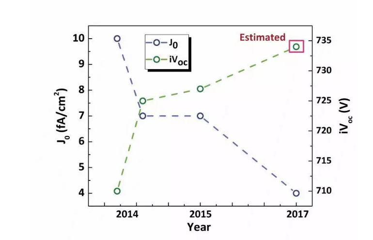 前表面与常规N型太阳能电池或N-PERT太阳能电池没有本质区别,主要区别在于背面。硅片背面采用硝酸湿法氧化出一层1.4 nm左右的极薄氧化硅层,并利用PECVD在氧化层表面沉积一层20 nm厚的磷掺杂的微晶非晶混合Si薄膜。钝化性能需通过后续退火过程激活,Si薄膜在该退火过程中结晶性发生变化,由微晶非晶混合相转变为多晶。在850 °C的退火温度下退火,iVoc > 710 mV, J0在9-13 fA/cm²,显示了钝化接触结构优异的钝化性能。所制备的电池效率超过23%,其余电性能参数如Voc, Jsc和FF在表1中列出。下图2和图3分别为Fraunhofer-ISE 的单晶钝化接触太阳能电池的效率提升及钝化性能改善曲线,从中可以看到钝化接触技术对于效率提升的潜力。目前N型前结钝化接触太阳能电池世界纪录(25.8%)由该研究所保持(其余电性能参数见表1)。