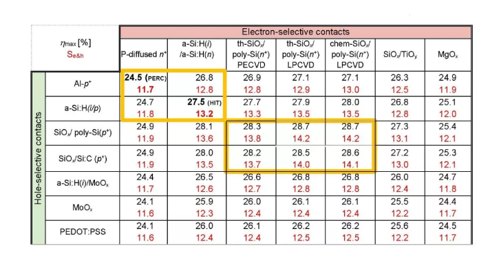 图5为不同电子/空穴选择性材料结合组成的太阳能电池的极限效率计算,电子选择性材料SiOx/n+ Poly-Si与空穴选择性材料SiOx/p+ Poly-Si结合的电池的选择性可以达到13.8~14.2,高于电子选择性材料a-Si:H(i)/a-Si:H(n+)与空穴选择性材料a-Si:H(i)/a-Si:H(p+)结合的电池,即HIT,因而具有更加高的效率极限(28.2%~28.7%),高于HIT的27.5%极限效率,同时也远远高于PERC电池(24.5%),最接近晶体硅太阳能电池理论极限效率(29.43%)[6]。
