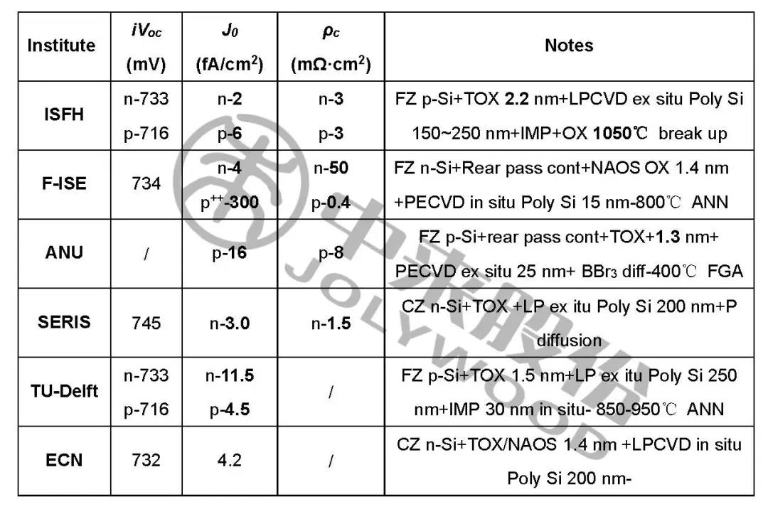 表2. 不同研究所的钝化接触太阳能电池钝化接触性能