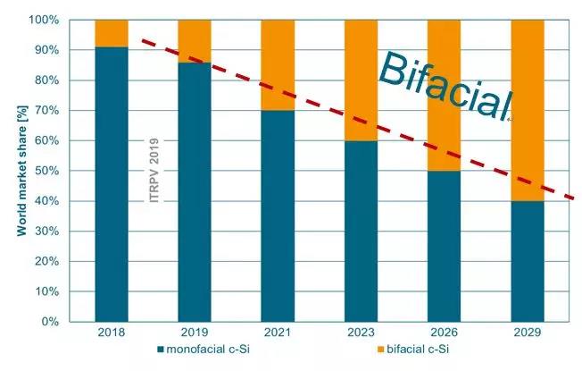 图8. ITRPV 2019预测双面电池市场份额发展趋势[12]