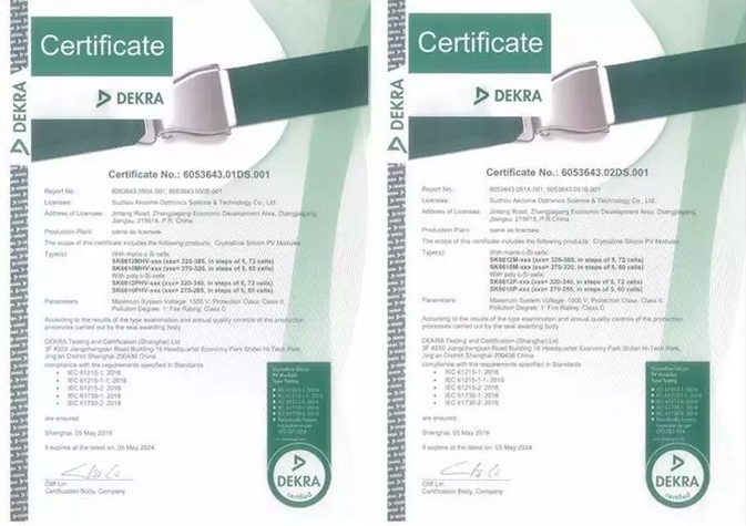 该证书的颁发表明了爱康光电旗下这两款产品通过DEKRA德凯按照IEC 61215-1:2016, IEC 61215-1-1:2016, IEC 61215-2:2016, IEC 61730-1:2016以及IEC 61730-2:2016系列标准的测试。