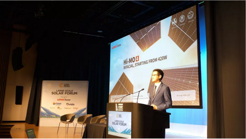 本次论坛吸引了500多名澳大利亚大型太阳能行业高级代表参加。论坛现场,隆基乐叶澳大利亚总经理毛波宣布隆基430W Hi-MO 4 产品在澳洲正式发布。新品发布会仪式邀请了澳大利亚清洁能源委员会首席执行官Kane Thornton与隆基乐叶澳大利亚公司总经理毛波一起为新品揭幕,论坛现场气氛被推向高潮。