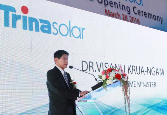 泰国副总理威萨努·克安在投产仪式上表示,天合光能选择在泰国设厂是对泰国投资政策、基础设施、人力资源的综合认可,能为中泰两国源远流长的历史友谊作出贡献,为两国深化经贸合作作出贡献。