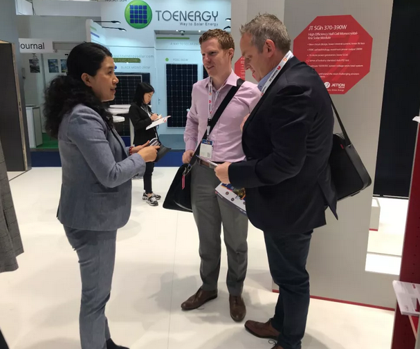 长久以来,中建材浚鑫高效产品深受客户青睐。中建材浚鑫此次展出的半片单晶PERC组件JT SGh以及MBB PERC双玻组件JT STm,受到了大量客户的咨询。同时,最新出品的JT STh 单晶PERC双面双玻高效组件,背部发电增益最高可达25%,整体组件的输出功率得到了大幅的提升,72电池板型最高输出可达480W,大幅降低了系统发电成本。