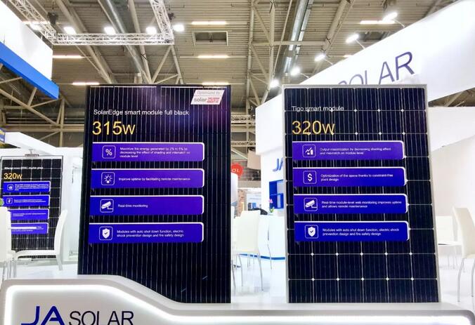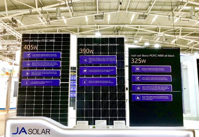 展会中,晶澳精选了11款高效组件,九主栅单晶PERC半片组件(JAM72S10-405/MR),九主栅单晶PERC半片全黑组件(JAM60S17-325/MR),单晶PERC双面组件(JAM72S09-390/BP)等高效组件吸引了众多参展观众。