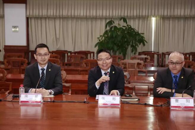 汉能薄膜发电集团执行董事兼高级副总裁张彬先生(中)对美国绿色建筑委员会&绿色事业认证公司总裁兼首席执行官马晗先生一行表示欢迎