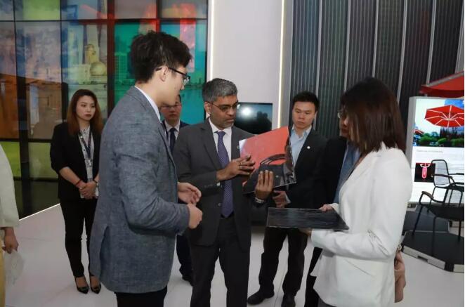 汉能薄膜发电集团执行董事兼高级副总裁张彬先生(右一)向美国绿色建筑委员会&绿色事业认证公司总裁兼首席执行官马晗先生(中)介绍汉能产品