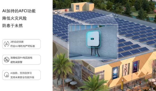 AI加持,你可信赖的安全卫士:电弧是光伏系统引发火灾的隐患,一旦火灾,损失巨大。华为分布式逆变器集成了基于AI技术的智能拉弧检测AFCI(Arc Fault Circuit Interrupter)功能,能够检测并判断电弧的产生,并有效切断并网开关,消除电弧,防患于未燃。而机器学习的人工智能技术引入,使逆变器不断累积检测出电弧的特征参数,从而优化和提高识别电弧的能力,更精准,可靠的检测出真实电弧,给你的电站加上一道安全的防护锁。
