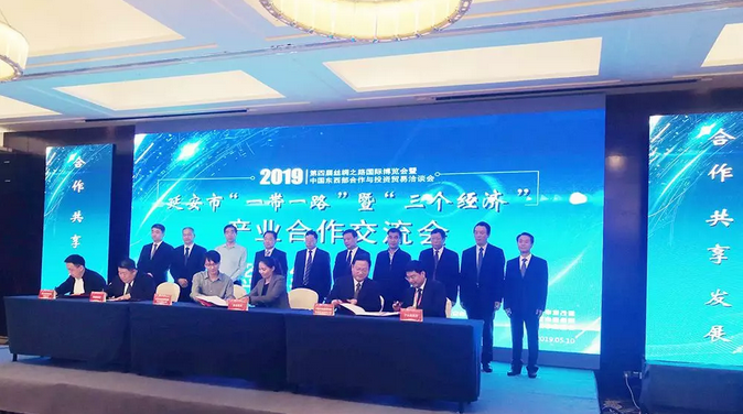 ▲启迪清芸总经理牛道恒(前排左三)在丝博会延安市“一带一路”暨“三个经济”产业合作交流会上签约