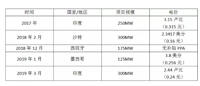 据不完全统计,中东、拉丁美洲、东南亚、欧洲等地都已经出现了低于国内煤电标杆上网电价的光伏项目,最低中标纪录是阿布扎比未来能源公司(MASDAR)和法国电力公司(EDF)合作的Sasaka 300MW光伏项目,电价只有1.786美分/kWh,折合人民币0.12元/kWh,甚至低于国内水电价格。