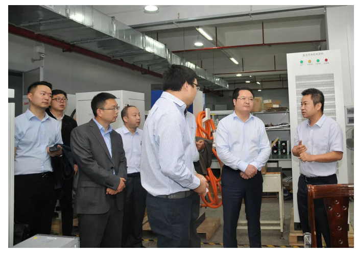 在董事长何佳、总裁陈硕等人的陪同下,何东董事长一行参观了智能制造总装车间、检测中心、研发中心、研发实验室、智慧城市&大数据实验室、储能电站及国家重点研发项目等,详细了解了易事特在数据中心、储能、微电网、充电桩、轨道交通等高新技术产业的研发与技术实力。