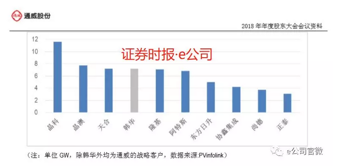截至到2018年末,通威太阳能已形成3GW多晶、9GW单晶电池共12GW产能规模;2019年3月,通威股份又启动了成都四期及眉山太阳能电池项目。随着新建产能的陆续投产,预计2019年底,通威股份太阳能电池规模将达到20GW。据通威股份透露,通威太阳能以规模、技术及质量优势拥有了稳定的战略合作客户,已与全球前十大下游组件商中的九家建立长期战略合作关系。