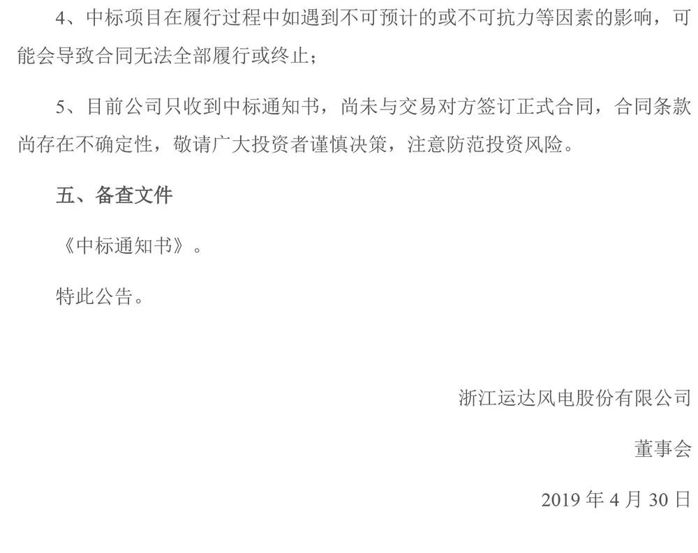 运达股份4月30日发布公告,公司被华能集团确定为尚义大苏计等十九个风电项目共计1328兆瓦风力发电机组及其附属设备(含塔筒)集中采购标包一项目的中标人,中标总金额为2,571,692,120.00元,占公司2018年营业收入的77.65%。