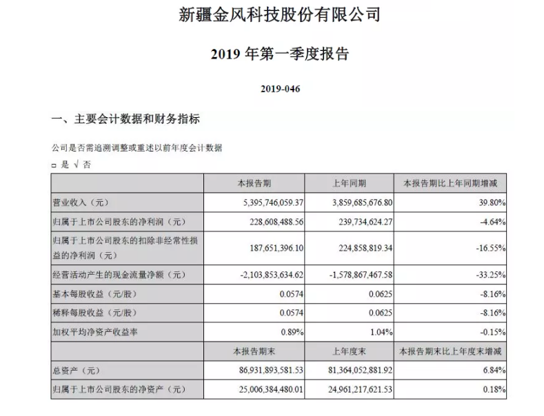 4月26日,金风科技公布2019年第一季度报告,截至2019年3月31日止3个月,集团实现营业收入53.96亿元,同比增加39.80%;归属于上市公司股东净利润2.29亿元。
