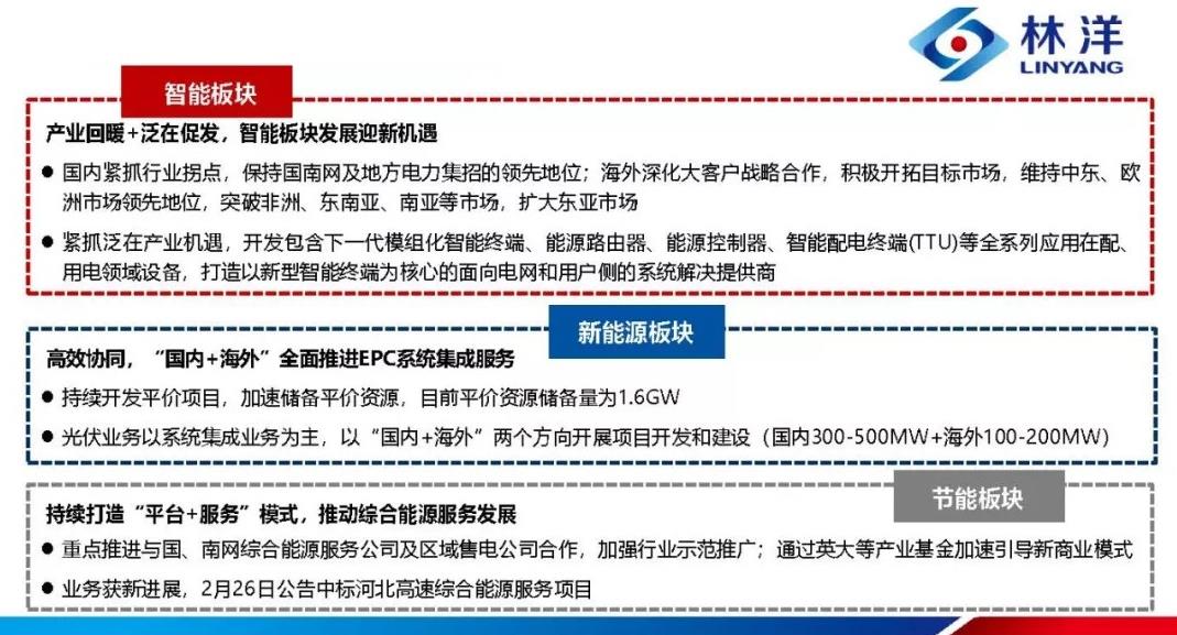 在海外智能用电业务的拓展方面,有效推进大客户战略,全面合作开拓全球市场,与各国的当地合作伙伴一起深耕当地市场。报告期内,实现海外销售 3,805 万美元,在手订单达 4,800 万美元。