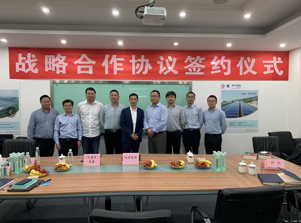 2019年4月24日,中建材浚鑫科技有限公司(以下简称“中建材浚鑫”)和远景能源(江苏)有限公司(以下简称“远景”)在江阴中建材浚鑫总部举行了1GW分布式光伏电站、分布式风电、储能项目合作开发以及数字化能源管理的战略合作签约仪式,预计两年内合作500MW,未来3-5年的达成1GW的目标。中建材浚鑫高级副总裁赵宏雷、远景副总裁及光伏业务总经理孙捷分别代表双方签署协议。中建材国际工程集团有限公司副总裁、中建材浚鑫科技有限公司总经理孙杰,中建材浚鑫中国事业部副总裁胡桂所、商务管理总监凡金星,中建材新能源工程有限公司总经理都宏伟、副总经理王立宁、宦俊,远景光伏投资开发总监肖杰、光伏投资开发经理王进强等代表出席了签约仪式。