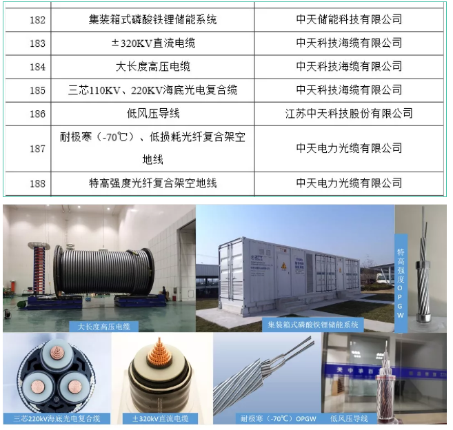 近日,国家电网公司发布了220项新技术(新产品)评估结果。中天科技旗下中天科技海缆有限公司“±320kV直流电缆”、“大长度高压电缆”、“三芯110kV、220kV海底光电复合缆”,中天电力光缆有限公司“耐极寒(-70℃)、低损耗光纤复合架空地线”、“特高强度光纤复合架空地线”,江苏中天科技股份有限公司“低风压导线”以及中天储能科技有限公司“集装箱式磷酸铁锂储能系统”,共7项新技术(产品)入选。