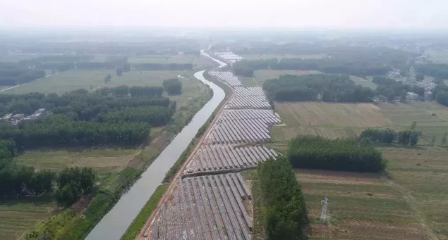 安徽临泉吕寨20MW分布式光伏电站是临泉县第一座大型扶贫光伏电站,采用了社会与政府共同出资的方式建设。电站位于临泉县与阜南县的边界,以谷河为边界的两座县城,南岸是一片金黄色的麦田,而北岸则即将是一片蔚蓝的光伏电站。这一黄一蓝、一边一色,加上青翠河谷的绚丽的日光,呈现出了一幅非常壮美的画卷。