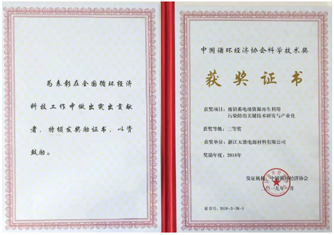 近日,2018年度中国循环经济协会科学技术奖获奖名单公布。天能电源材料有限公司的《废铅蓄电池资源再生利用污染防治关键技术研发与产业化》项目“榜上有名”。