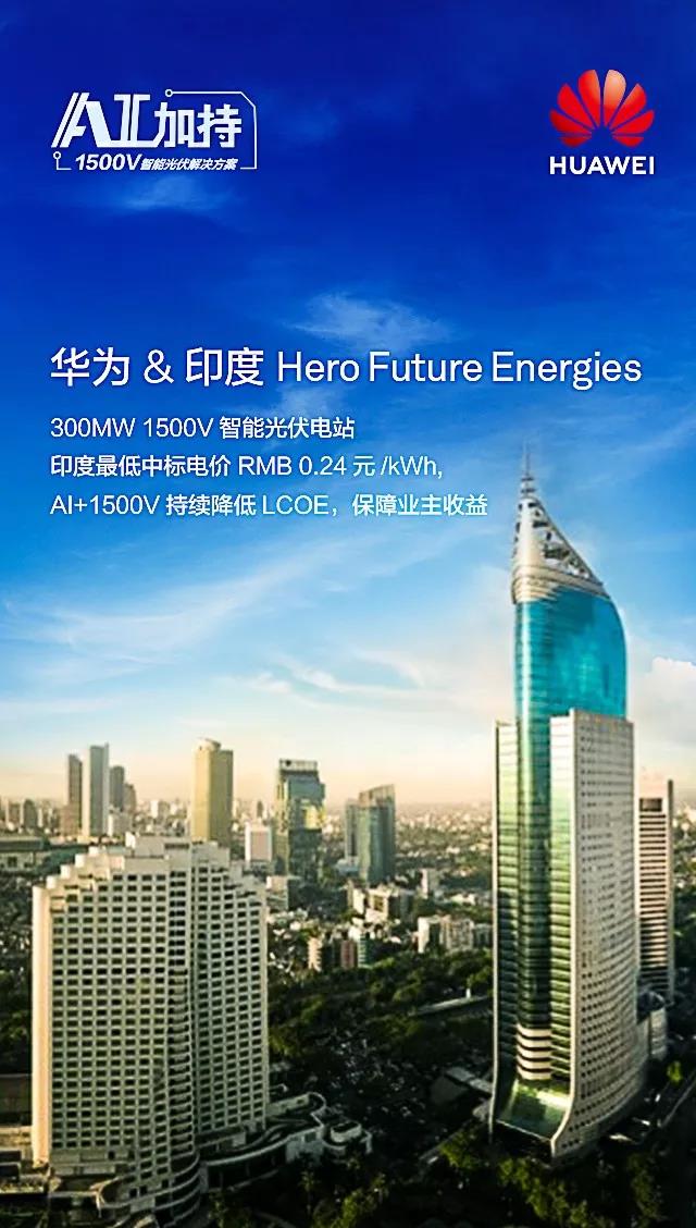 Hero Future Energies是印度领先的可再生能源开发商,在当地拥有极佳的口碑和信誉,光伏装机规模超过1GW。Bhadla Solar Park 300MW光伏项目中标电价2.47卢比/kWh,为当时印度最低,全部采用华为1500V智能光伏解决方案。