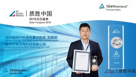 3月21日,在TÜV莱茵“质胜中国”优胜奖颁奖典礼上,中来股份双面组件获得了“光伏组件户外发电量优胜奖”。在林建伟看来,TÜV莱茵是一家值得尊重的第三方机构,在全球光伏领域拥有雄厚的检测认证和技术评估实力。在充分认知产品的价值所在、发现新技术的价值上一直走在行业前列。“早在多年前,中来光伏背板产品便获得了TÜV莱茵国内首张认证证书,今天中来双面发电产品又获得了TÜV莱茵的奖项,中来对TÜV莱茵的认可表示感谢。”