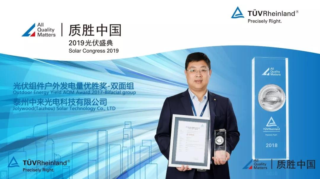 荣耀加冕!中来股份斩获2018年TÜV莱茵“质胜中国”双面组光伏组件户外发电量优胜奖
